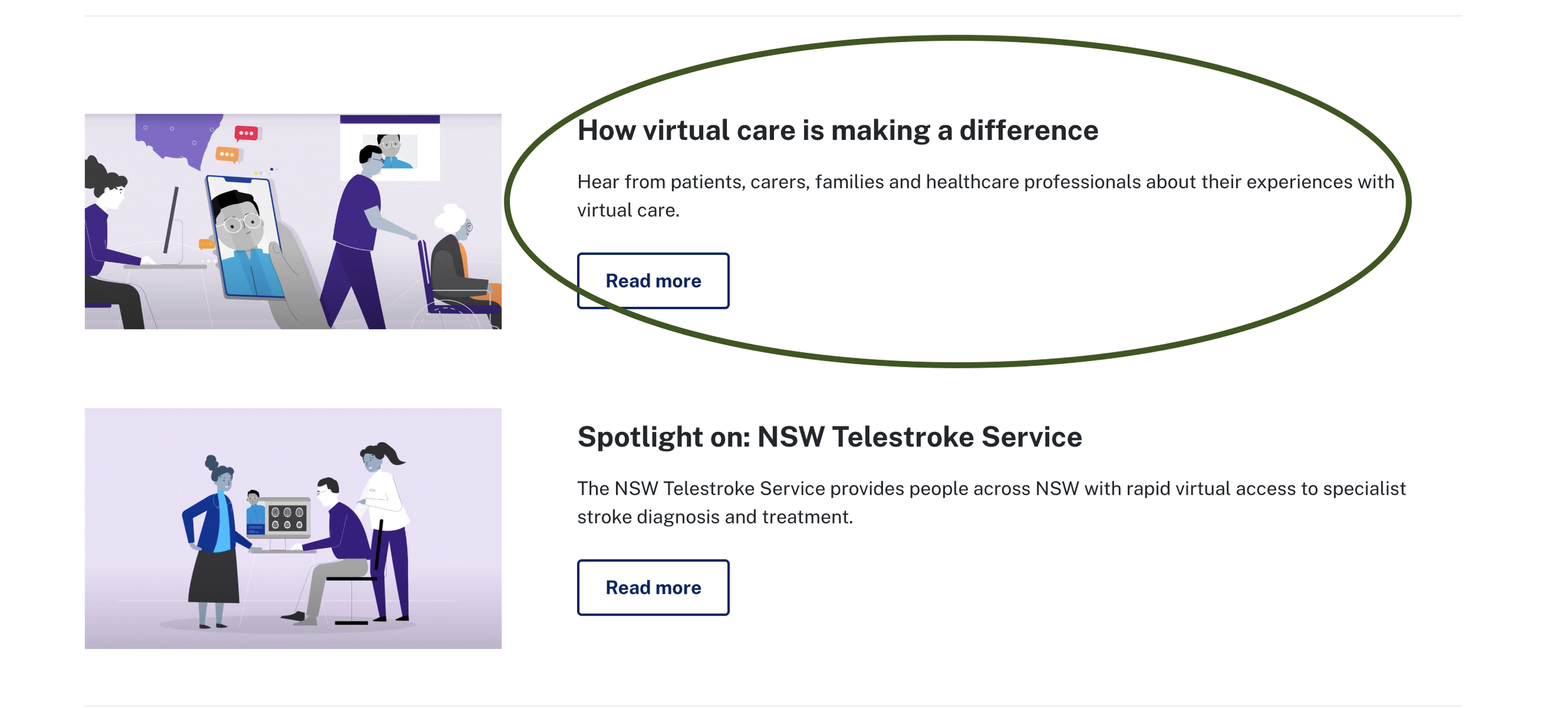 We have brought out a search service directory for NSW Health where people can search for a specific health service near them by using filters, tags and keywords to refine results. On these service/facility result point of interest pages (POI page) it will state whether the service offers Virtual Care and if so, it will take them back to the Virtual Care hub where they can learn more information.